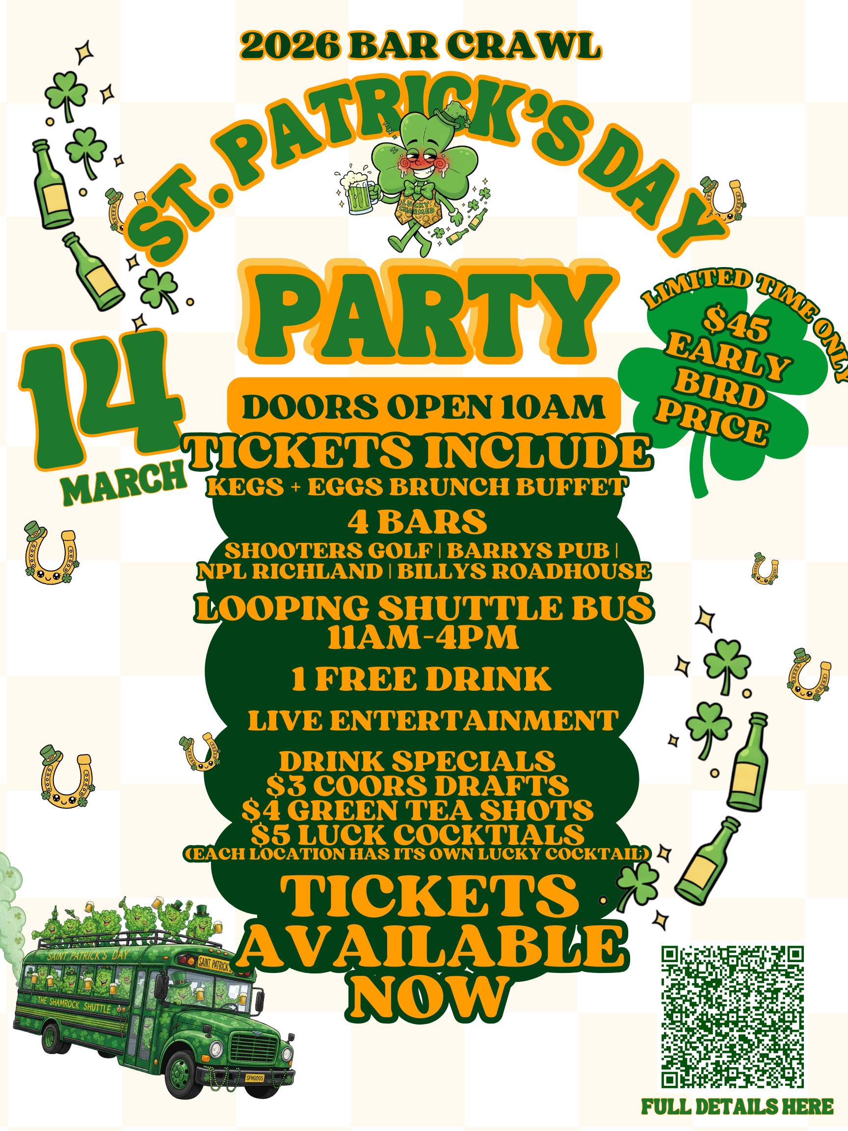 Join us March 14 for our annual St. Patrick’s Day Bar Crawl featuring Kegs + Eggs brunch buffet, 4 bars, a looping shuttle (11AM to 4PM), 1 free drink, live entertainment, and drink specials all day. Doors open at 10AM. Early bird tickets: $45 (limited time).